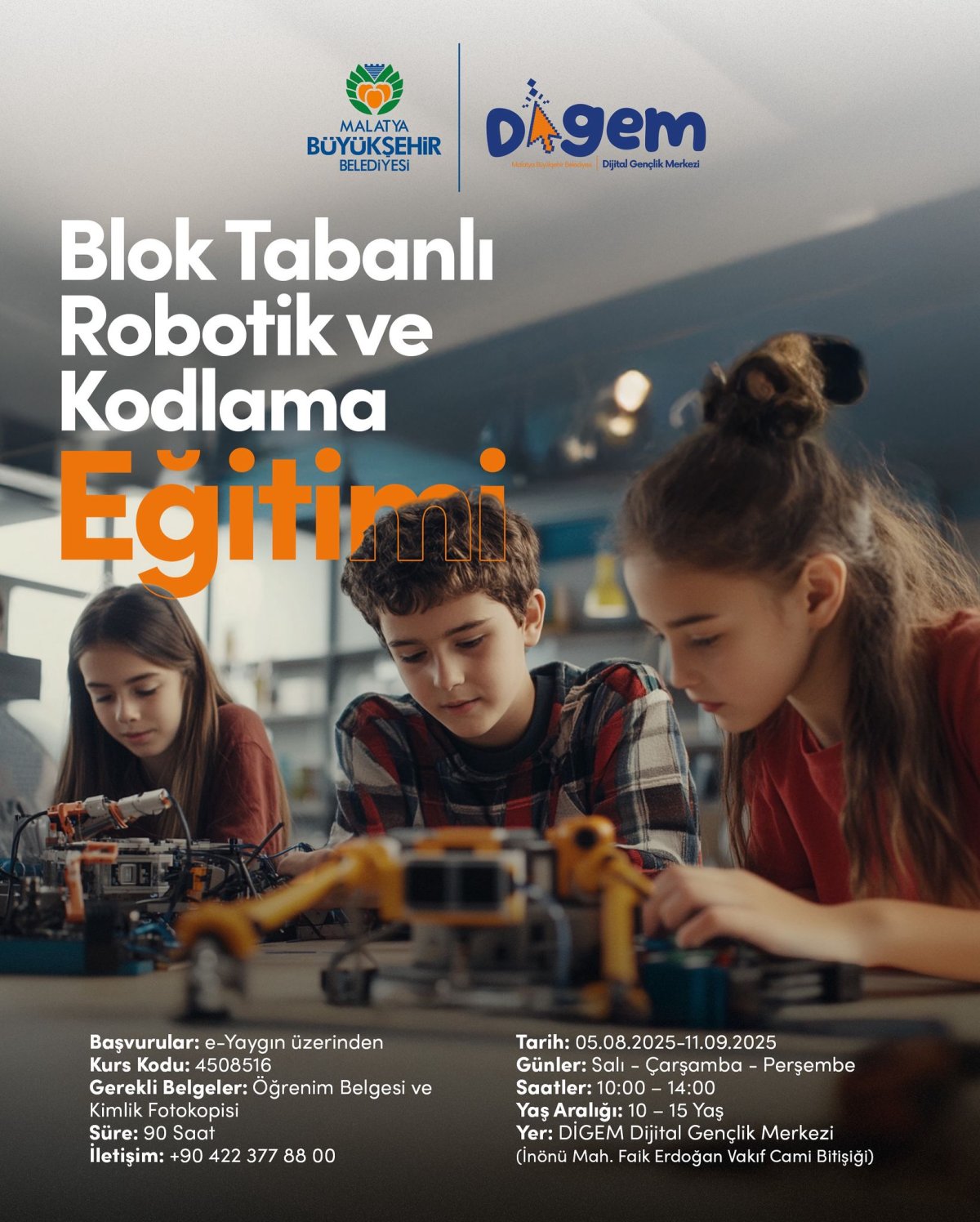 Teknolojiye meraklı 10-15 yaş arasındaki gençler için özel olarak tasarlanan "Blok Tabanlı Robotik ve Kodlama Eğitimi" programı başlıyor. Bu eğitimde gençlere temel algoritma, kodlama prensipleri ve robotik uygulamalar öğretilecek. Eğitim, blok tabanlı kodlama arayüzü sayesinde katılımcılara oyunlaştırılmış ve anlaşılır bir öğrenme deneyimi sunacağı belirtildi.
