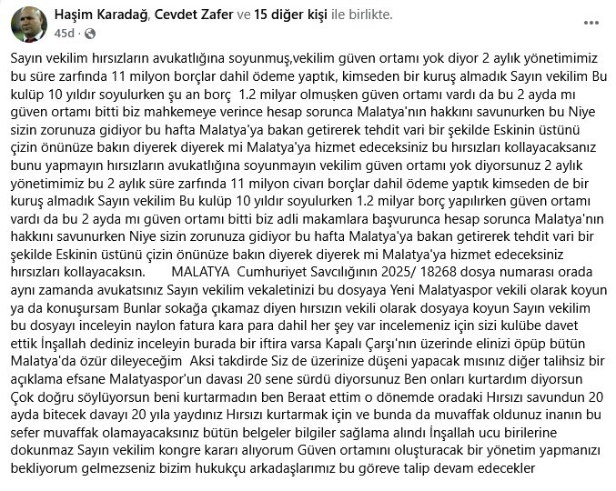 "Sayın vekilim hırsızların avukatlığına soyunmuş,vekilim güven ortamı yok diyor 2 aylık yönetimimiz bu süre zarfında 11 milyon borçlar dahil ödeme yaptık, kimseden bir kuruş almadık Sayın vekilim Bu kulüp 10 yıldır soyulurken şu an borç 1.2 milyar olmuṣken güven ortamı vardı da bu 2 ayda mı güven ortamı bitti biz mahkemeye verince hesap sorunca Malatya'nın hakkını savunurken bu Niye sizin zorunuza gidiyor bu hafta Malatya'ya bakan getirerek tehdit vari bir şekilde Eskinin üstünü çizin önünüze bakın diyerek diyerek mi Malatya'ya hizmet edeceksiniz bu hırsızları kollayacaksanız bunu yapmayın hırsızların avukatlığına soyunmayın vekilim güven ortamı yok diyorsunuz 2 aylık yönetimimiz bu 2 aylık süre zarfında 11 milyon civarı borçlar dahil ödeme yaptık kimseden de bir kuruş almadık Sayın vekilim Bu kulüp 10 yıldır soyulurken 1.2 milyar borç yapılırken güven ortamı vardı da bu 2 ayda mı güven ortamı bitti biz adli makamlara başvurunca hesap sorunca Malatya'nın hakkını savunurken Niye sizin zorunuza gidiyor bu hafta Malatya'ya bakan getirerek tehdit vari bir şekilde Eskinin üstünü çizin önünüze bakın diyerek diyerek mi Malatya'ya hizmet edeceksiniz hırsızları kollayacaksın. MALATYA Cumhuriyet Savcılığının 2025/ 18268 dosya numarası orada aynı zamanda avukatsınız Sayın vekilim vekaletinizi bu dosyaya Yeni Malatyaspor vekili olarak koyun ya da konuşursam Bunlar sokağa çıkamaz diyen hırsızın vekili olarak dosyaya koyun Sayın vekilim bu dosyayı inceleyin naylon fatura kara para dahil her şey var incelemeniz için sizi kulübe davet ettik İnşallah dediniz inceleyin burada bir iftira varsa Kapalı Çarşı'nın üzerinde elinizi öpüp bütün Malatya'da özür dileyeceğim Aksi takdirde Siz de üzerinize düşeni yapacak mısınız diğer talihsiz bir açıklama efsane Malatyaspor'un davası 20 sene sürdü diyorsunuz Ben onları kurtardım diyorsun Çok doğru söylüyorsun beni kurtarmadın ben Beraat ettim o dönemde oradaki Hırsızı savundun 20 ayda bitecek davayı 20 yıla yaydınız Hırsızı kurtarmak için ve bunda da muvaffak oldunuz inanın bu sefer muvaffak olamayacaksınız bütün belgeler bilgiler sağlama alındı İnşallah ucu birilerine dokunmaz Sayın vekilim kongre kararı alıyorum Güven ortamını oluşturacak bir yönetim yapmanızı bekliyorum gelmezseniz bizim hukukçu arkadaşlarımız bu göreve talip devam edecekler"