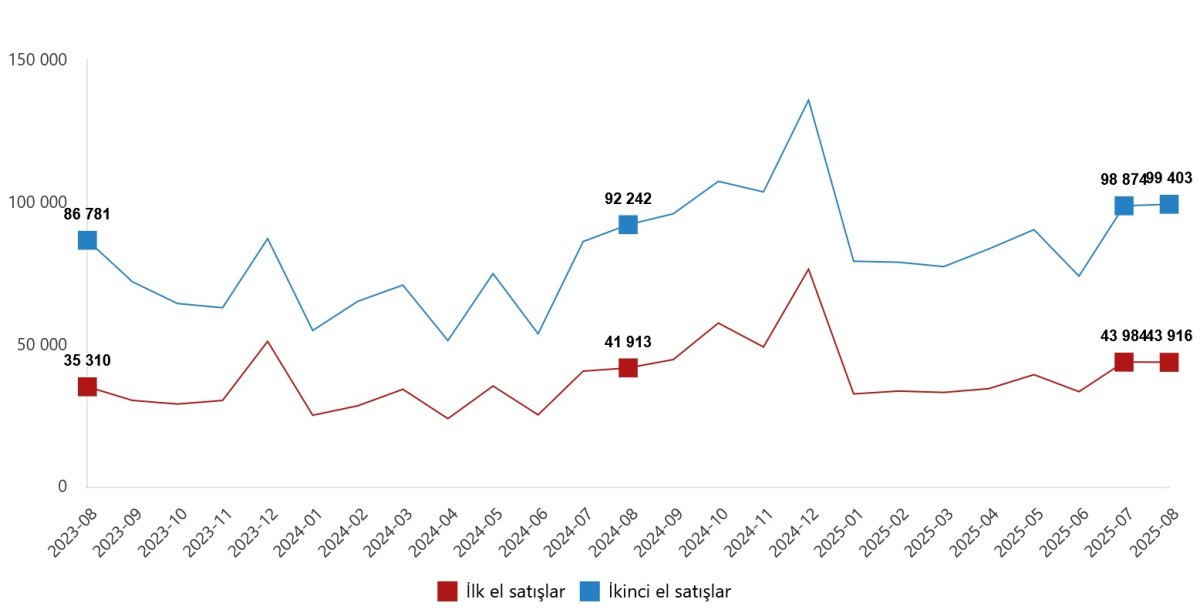 Türkiye genelinde ikinci el konut satış sayısı Ağustos ayında bir önceki yılın aynı ayına göre %7,8 oranında artarak 99 bin 403 oldu. Toplam konut satışları içinde ikinci el konut satışının payı %69,4 oldu. İkinci el konut satışları Ocak-Ağustos döneminde ise bir önceki yılın aynı dönemine göre %24,0 oranında artarak 682 bin 546 olarak gerçekleşti.